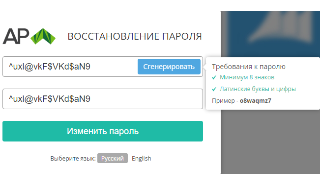 - На форме Восстановление пароля ввести новый пароль в поля Новый пароль и Подтверждение нового пароля. Требования к паролю указаны по всплывающей подсказке. Требования, которые удовлетворены, выделяются в подсказке цветом и флажком. Пароль можно получить автоматически, нажав кнопку Сгенерировать.
