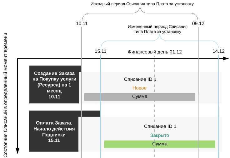 - Для Списаний типа Плата за установку, Плата за продление, Плата за перенос изменяются такие атрибуты, как Статус и Период Списания.