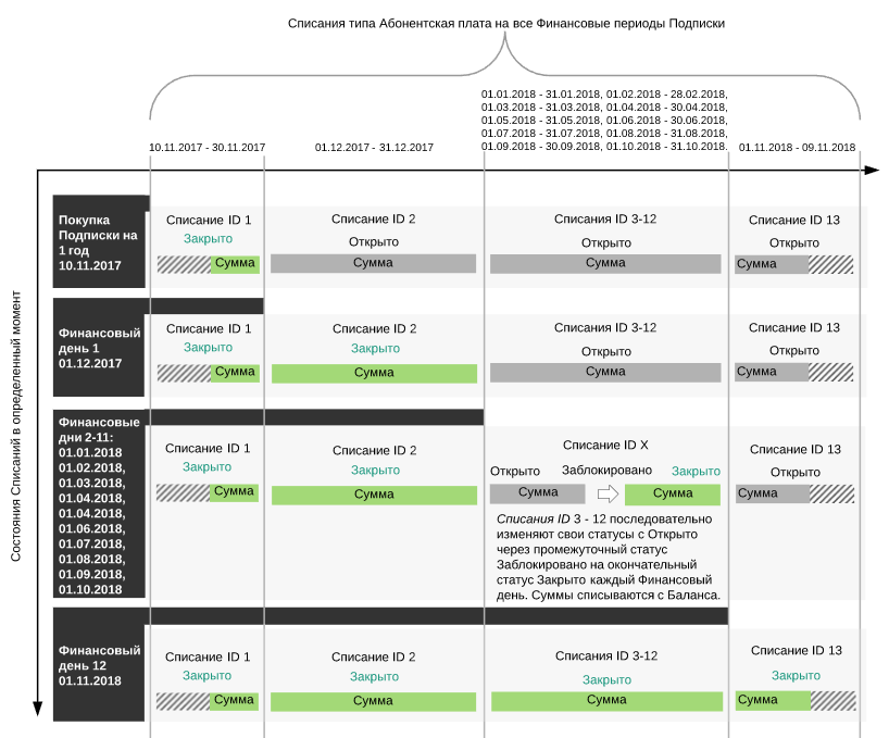 - В каждый следующий Финансовый день до 12-го включительно следующее по счету Списание переходит из статуса Открыто через промежуточный статус Заблокировано в статус Закрыто, и происходит списание соответствующей суммы с Баланса Клиента.
