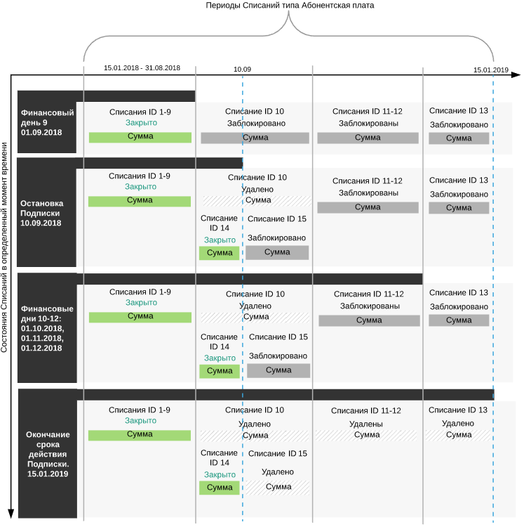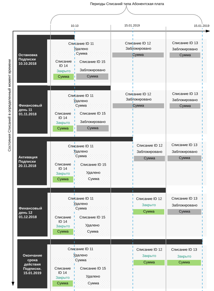 На схеме ниже показано поведение Списаний при остановке Подписки.