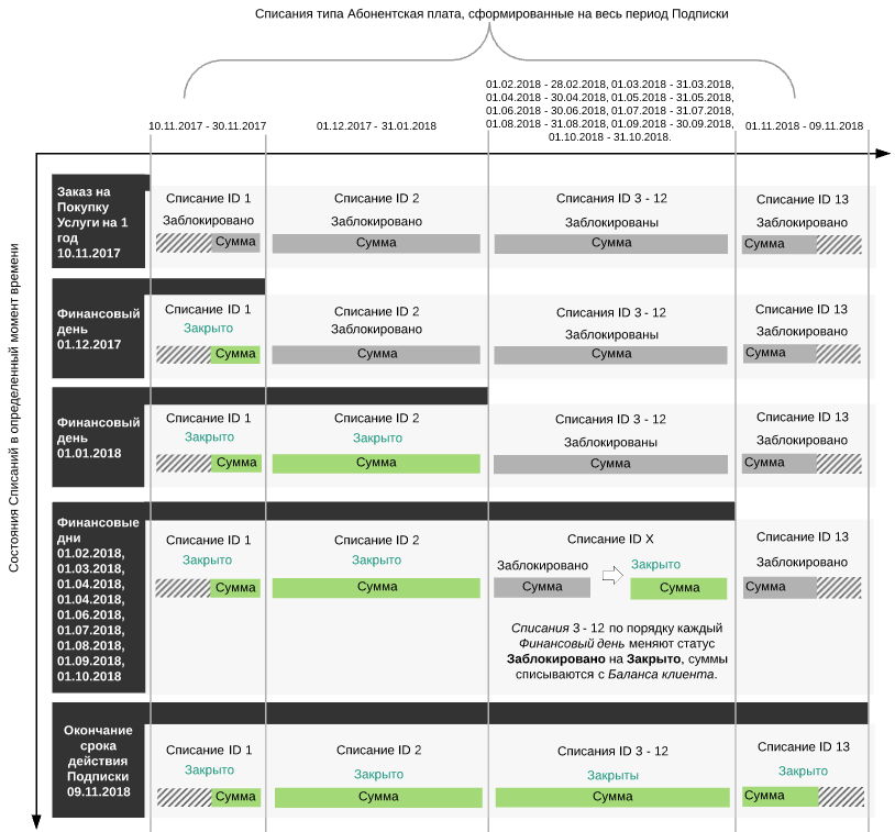 После оплаты Заказа Списания 1 -13 блокируют денежные средства на Балансе клиента и имеют статус Заблокировано. При наступлении ближайшего Финансового дня Списание 1 переходит в статус Закрыто, и происходит уменьшение Баланса клиента на сумму Списания 1. При наступлении следующего Финансового дня Списание 2 переходит в статус Закрыто, и происходит уменьшение Баланса клиента на сумму Списания 2 и т.д.