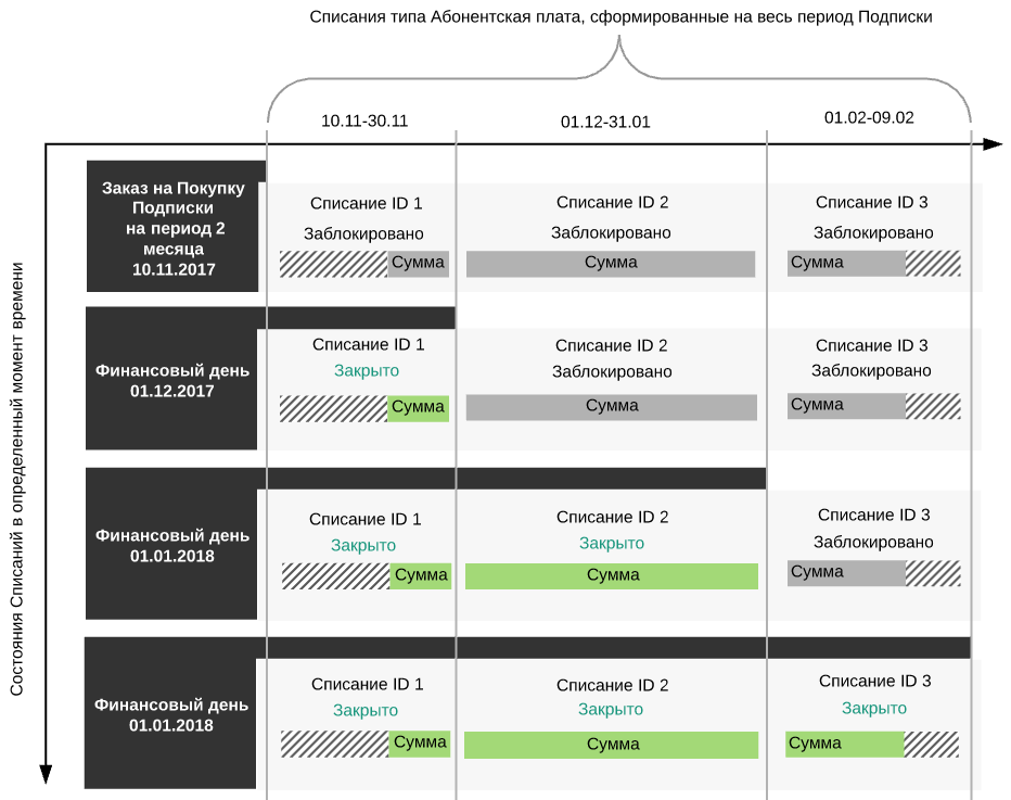 Случай оплаты Заказа не в день его создания описан в статье Изменение атрибутов Списаний.- Формируются ежемесячные Списания 1 - 3 на каждый Финансовый период в течение всего периода Подписки.