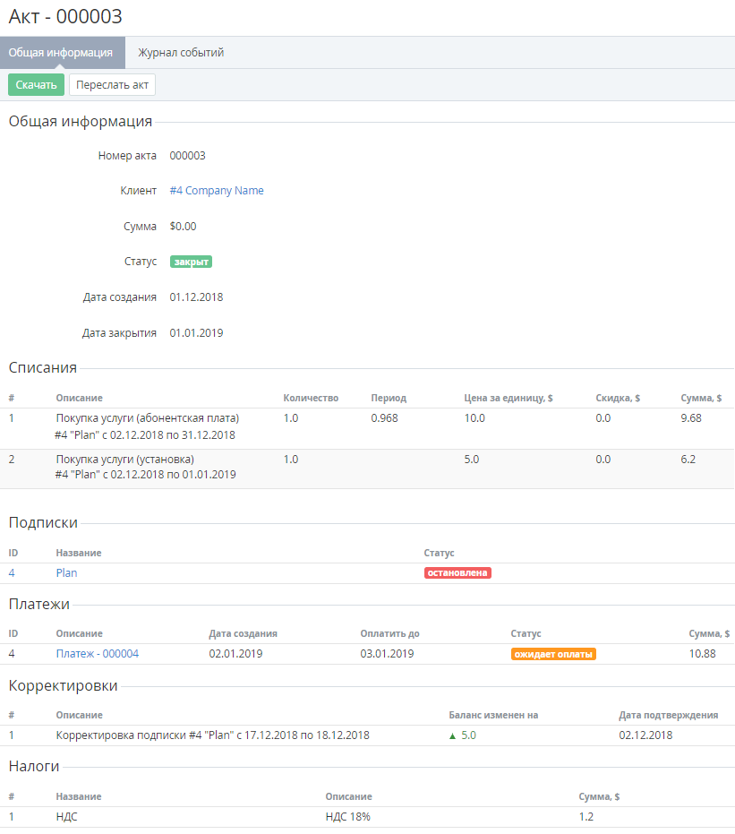 Чтобы просмотреть подробную информацию об Акте для модели Постоплата (см. Создание Правила обслуживания), необходимо: