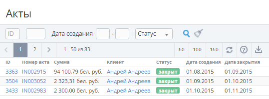 - На Панели навигации перейти в раздел Акты (см. Навигация по Панели управления Оператора). Откроется страница Акты.