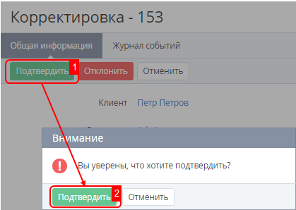 - В возникшем диалоге нажать кнопку Подтвердить. Корректировка будет подтверждена.
