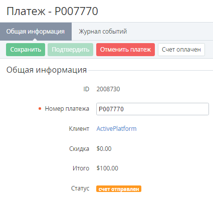 - Щелкнуть по ID или номеру нужного Платежа со статусом Счет формируется. В рабочей области появится страница Платежа (см. Просмотр деталей Платежа).