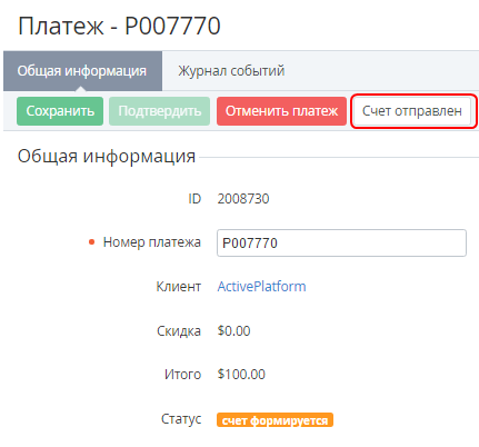 Если при формировании Платежа был выбран метод оплаты "Банковский перевод - ручное выставление счета" Сотрудник создает Счет на оплату вручную, отправляет счет Клиенту, а затем меняет статус Платежа на Счет отправлен.