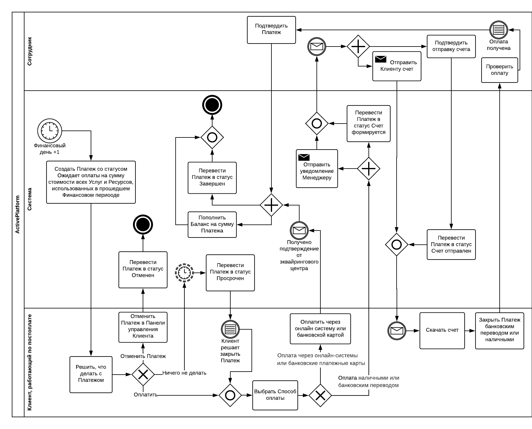 Жизненный цикл Платежа для расчета за оказанные Услуги показан на схеме. Информацию о нотации схемы можно найти здесь https://ru.wikipedia.org/wiki/BPMN.