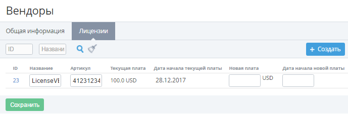 • Текущая плата - текущая плата по лицензии (в процентах или денежной единице вендора);