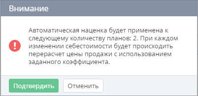 Нажать кнопку Применить для выбранных. Откроется окно подтверждения. Окно содержит информацию о количестве Тарифных планов, коэффициент автоматической наценки которых будет изменен.