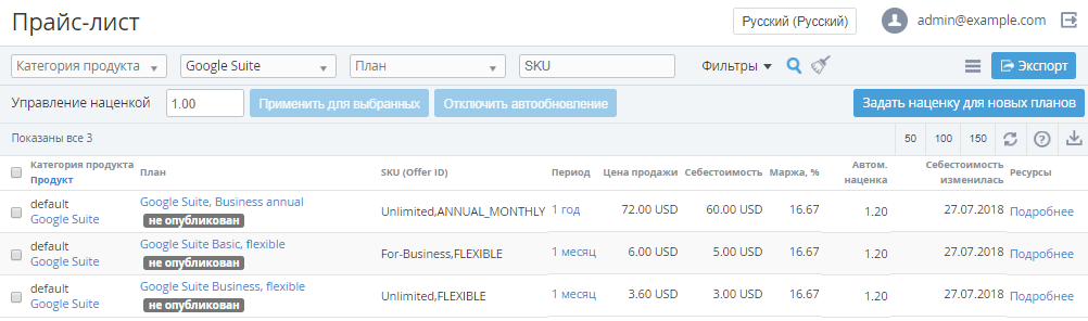 - Plan Resources fees (monthly) - абонентская плата за Ресурс Тарифного плана с учетом автоматической наценки, установленная на уровне текущего Реселлера.