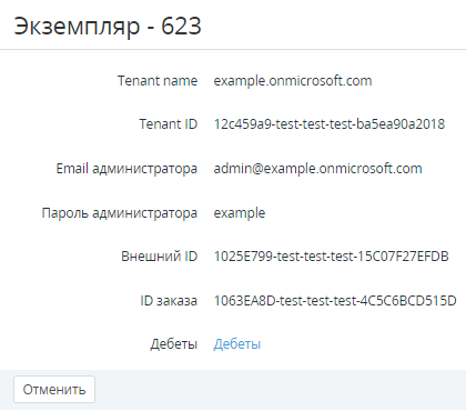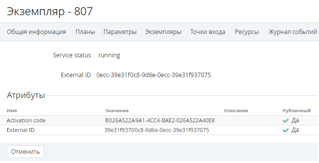 - Щелкнуть на ID или Названии необходимого Экземпляра. В рабочей области появится страница с подробной информацией о выбранном Экземпляре Услуги, которая предоставляется пользователям в рамках Подписки. Содержимое страницы зависит от типа Услуги.
