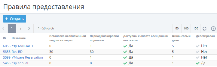 Просмотр списка Правил предоставления