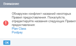 Если имя Правила предоставления, которое было делегировано нижестоящему Реселлеру совпадает с именем уже существующего Правила предоставления данного Реселлера, то при просмотре списка Правил предоставления отобразится всплывающее окно предупреждения: