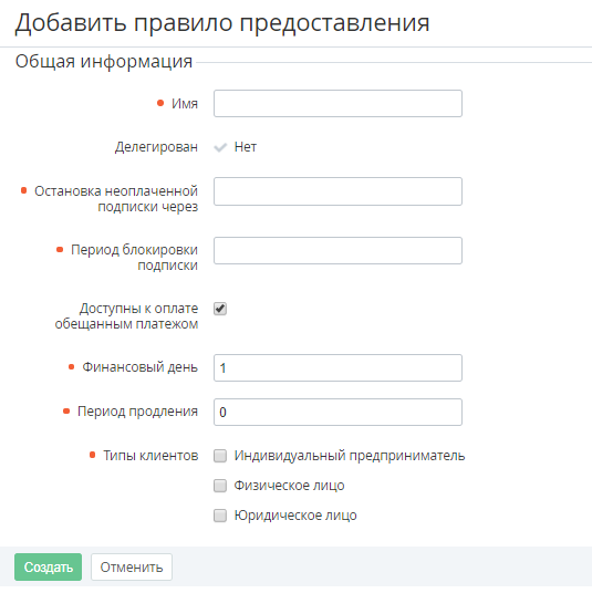 Установить флажки рядом с Типами клиентов (см. Типы клиентов), которым будут доступны для заказа Тарифные планы (см. Управление Тарифными планами), которые входят в данное Правило предоставления.