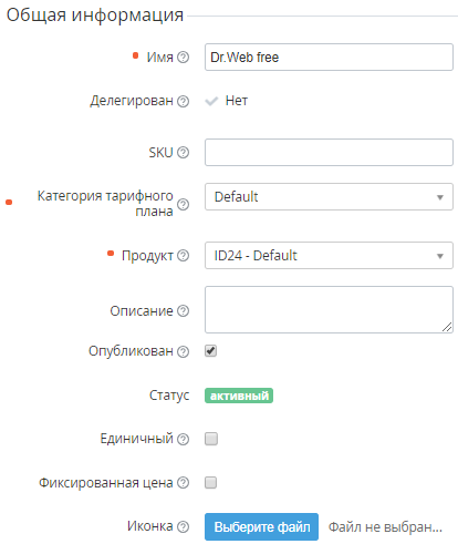 - Иконка - логотип для Тарифного плана, который отображается в Панели управления Клиента. Для добавления логотипа используется кнопка Выберите файл. Для удаления изображения используется ссылка Удалить иконку.