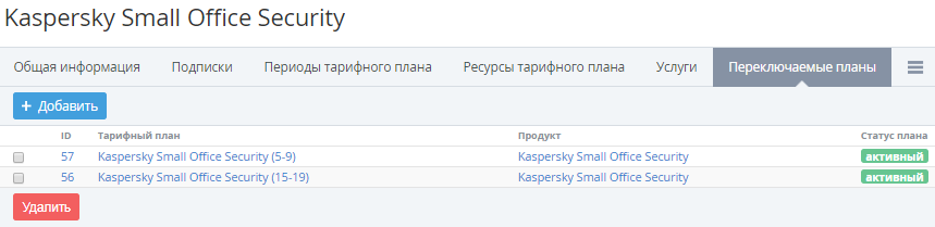 - Нажать кнопку Удалить. Выбранные Тарифные планы будут удалены с вкладки Переключаемые планы.