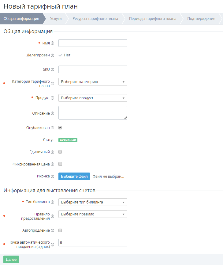 - Нажать кнопку Далее для перехода к настройке Услуг для Тарифного плана (см. Выбор Услуг для включения в Тарифный план).