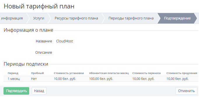 Чтобы сохранить информацию о созданном Тарифном плане, необходимо на шаге Подтверждение (см. Создание нового тарифного плана) выполнить следующие действия: