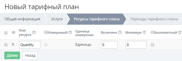 - Установить флажки в строках Ресурсов, которые должны входить в Тарифный план.