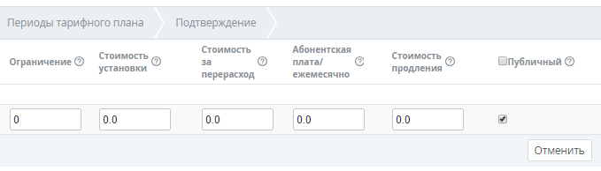 - В поле Стоимость за перерасход указать величину платежа в том случае, если Клиент осуществляет перерасход Ресурсов, включенных в Тарифный план.