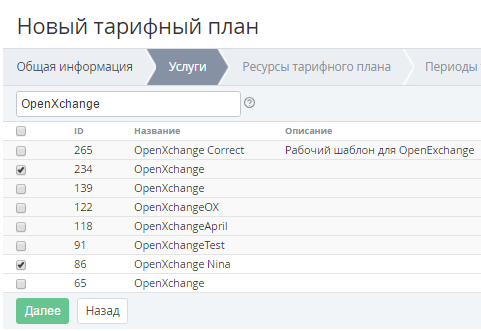 2. Нажать кнопку Далее для перехода к настройке Ресурсов Тарифного плана (см. Ресурсы тарифного плана).