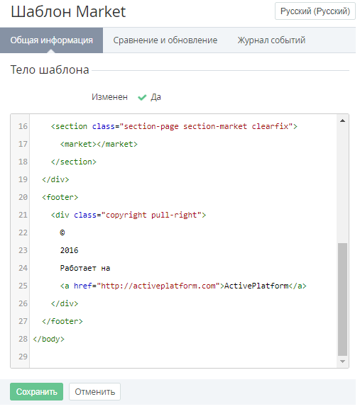 - На вкладке Общая информация изменить HTML код тела Шаблона. Изменения также могут быть внесены в режиме сравнения на вкладке Сравнение и обновление (см. Сравнение и обновление Шаблонов интерфейса).