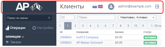 • Admin Header - шаблон верхней части страницы Панели управления Оператора.
