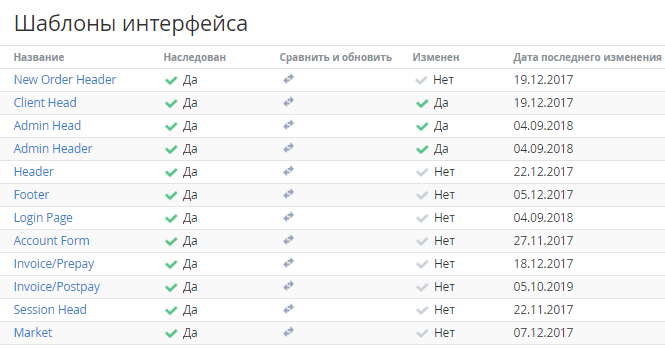 • Сравнить и обновить - содержит ссылку для перехода к странице сравнения текущего состояния Шаблона с состоянием Шаблона вышестоящего Реселлера или с состоянием Шаблона по умолчанию (для Оператора). Подробнее см. Сравнение и обновление Шаблонов интерфейса.