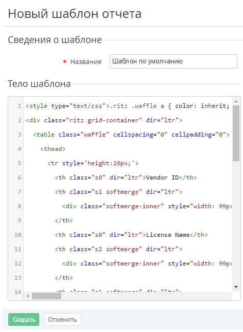7. Нажать кнопку Создать. Новый шаблон отобразится на странице Шаблоны отчетов по лицензиям (см. Общие настройки Отчетов по лицензиям).