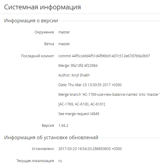 Страница Системная информация содержит на себе информацию о версии ActivePlatform (окружении, последнем обновлении) и установке обновлений.