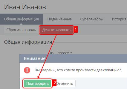 5. В возникшем диалоге нажать кнопку Подтвердить. Сотрудник будет деактивирован и получит статус Неактивный