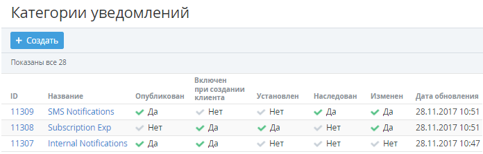 - Опубликован - признак использования уведомлений данной категории и возможности настройки данных уведомлений в Панели управления Клиента (включения или выключения получения уведомлений данной категории).