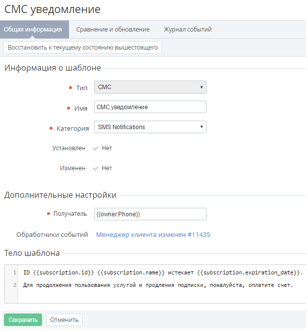 - Сравнение и обновление - содержит форму редактирования и сравнения текущего состояния Шаблона уведомления с состоянием соответствующего Шаблона у вышестоящего Реселлера. Вкладка отображается только для Шаблонов, которые были делегированы вышестоящим Реселлером и для Шаблонов, установленных по умолчанию (для Оператора). Подробнее см. Сравнение и обновление Шаблона уведомлений.