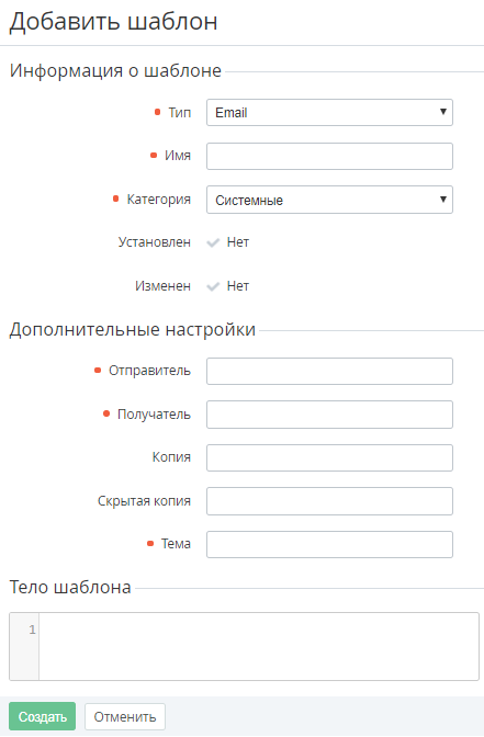 - На Панели инструментов страницы Шаблоны уведомлений нажать кнопку Создать. В рабочей области появится страница Добавить шаблон.