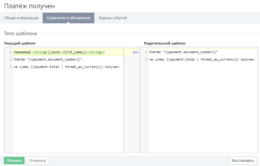 Сравнение и обновление доступно только для Шаблонов уведомлений, установленных по умолчанию (доступны только для Оператора) и для Шаблонов уведомлений, делегированных от вышестоящего Реселлера (см. Делегирование Шаблонов интерфейса, Шаблонов уведомлений, Событий уведомлений и Категорий уведомлений).