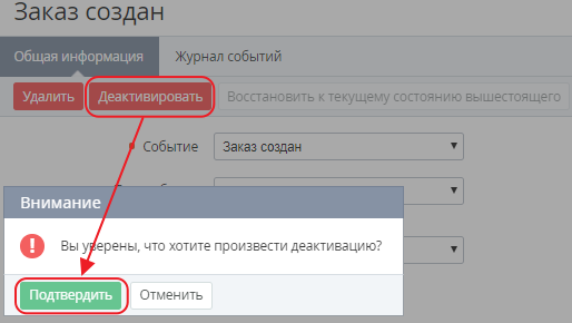 5. Нажать кнопку Подтвердить в диалоговом окне для подтверждения деактивации. Статус События уведомления примет значение неактивный.