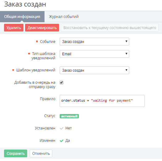 • Журнал событий - история изменений данного события уведомлений (см. Журнал событий).