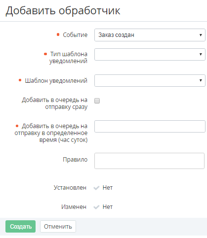 На Панели инструментов страницы События уведомлений нажать кнопку Создать. В рабочей области появится страница Добавить обработчик.