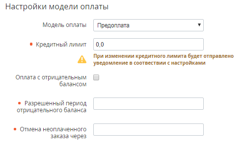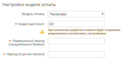 Для модели Постоплата опция Оплата с отрицательным балансом включена по умолчанию, и ее отключить нельзя.