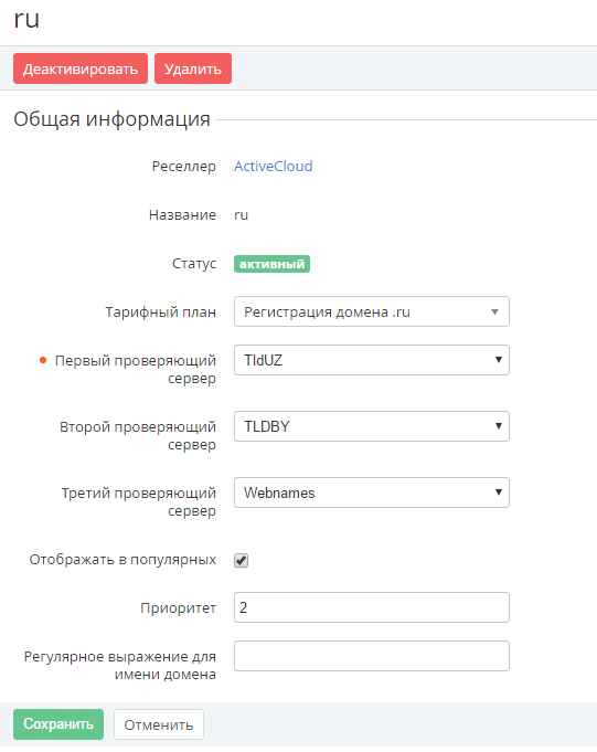 - Статус - текущий статус доменной зоны (см. Деактивация / активация Доменной зоны):