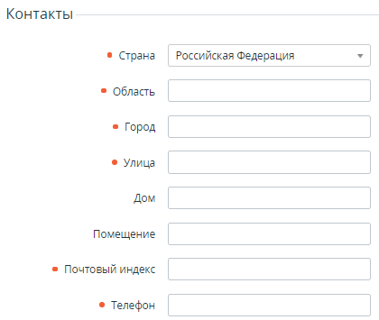 В группе элементов Контакты ввести адресную информацию о Клиенте, которая необходима при решении административных, технических или биллинговых вопросов.