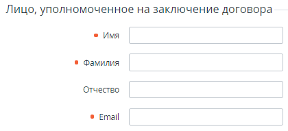 - В группе Лицо, уполномоченное на заключение договора ввести ввести имя, фамилию и при необходимости отчество уполномоченного лица Клиента, а также его email.