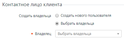 - Если Пользователь был создан ранее (см. Создание Пользователя ), то в поле Владелец необходимо выбрать существующего Пользователя, который будет связан с данным Клиентом и получит уровень доступа Владелец в Панель управления Клиента.