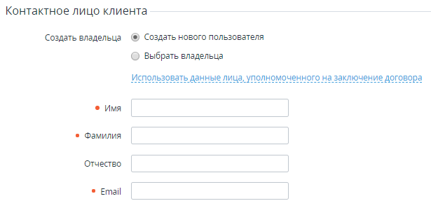 - В группе Контактное лицо клиента необходимо выбрать или создать Пользователя, который будет обладать уровнем доступа Владелец в Панель управления Клиента: