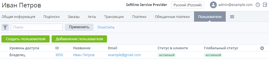 Каждый Клиент имеет как минимум одного Пользователя с правами Владелец, который либо выбирается при создании Клиента из списка существующих Пользователей, либо создается автоматически после добавления нового Клиента (см. Создание Клиента).