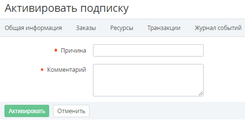 - В поле Причина ввести причину активации Подписки.