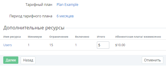 Если в предыдущем Тарифном плане заказано больше Ресурсов, чем доступно для заказа в новом, то перед переключением следует уменьшить количество Ресурсов (см. Изменение количества Ресурсов Подписки).