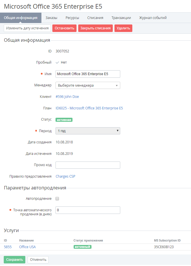 - MS Subscription ID - для Подписок на Тарифные планы, предоставляемые в рамках программы Microsoft CSP (см. Microsoft Legacy (Microsoft Office 365). Operator Guide), отображается ID Подписки в Microsoft Partner Center;