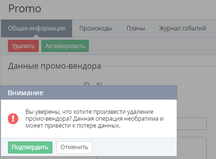 - Нажать кнопку Удалить в диалоговом окне для подтверждения удаления. Промо-вендор и связанные с ним промокоды будут удалены.